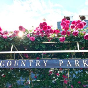つるバラ🌹パレード カントリーパークバラ園 令和の薔薇コーナーの フォトスポットです ベンチの後ろから頭上を覆う つるバラパレード💕 夕日を背に受け✨ 🏷乙女色クラブ 🏷ピンクワールドへようこそ 参加します💓