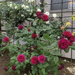 名前のわからない赤い薔薇が今年は株も大きくなり花数も増えました🌹うしろはホワイトメイデイランド咲き始めです❣️