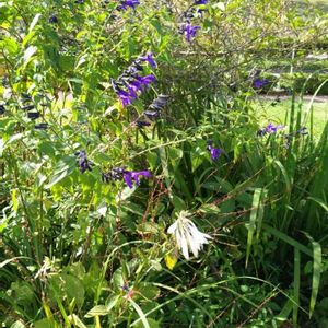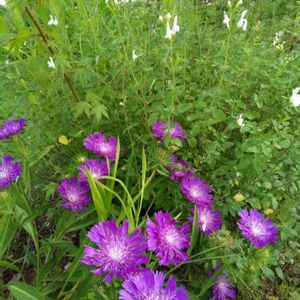 コミュニティガーデンにて 綺麗な紫のお花と後ろのかわいい白い花の名前を教えてください。よろしくお願いします🙇⤵️ 紫 ストケシア 白 チェリーセージ とほっこり畑さんに教えていただきました。ありがとうございました🤗 令和元年6月28日 撮影
