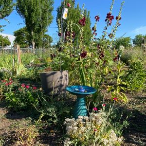 真夏のコミュニティガーデン。 今さっき、私のスペースに座って腰掛けて 撮ったもの。 今午後7時ですが、夏時間で時計が1時間進んでいるので8時になります。80℉って どのくらいかと思ったら、ほぼ27℃だそうです。 タチアオイがピンク色の方も咲き出し、 エクネシアも緑色の花芽がどんどん上がってきました🥰