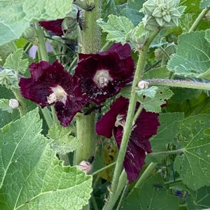 今日のお花はタチアオイ。 それで、コミュニティガーデンで育てているタチアオイ。 今はほぼてっぺんまで、咲き切っています。濃い色なので花粉が散っているのが目立ちますが、マルハナバチがよく蜜と花粉を集めにきています🐝