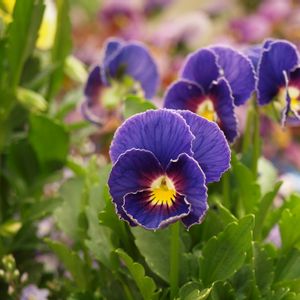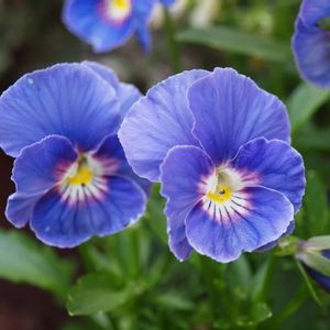 種からのビオラ。やっと咲いてきた小さい苗も頑張っています。エッジが白いものもあれば・・