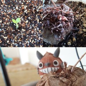 去年のお花から種を採った江原ビオラ ⬆️今年の一番乗りは赤みの紫の子 ポットのままですが💦 後ろのつぶつぶは3年目の花かんざし 刈り込みのタイミングを逃してシダレかんざしになっちゃってる💦 ↙️こぼれ種でクレマチスの挿し木の鉢に咲いてた子 ↘️去年のお気に入りのピンクの筈だったけど?…でも良い色✨