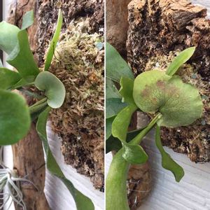 ビカクシダ・アルキコルネ(お店によると) 下段の幼苗を株分けtoコルク板付けしました。 株分けの時の根っこブチブチって変な汗出ますね。あー時間かかった(°_°) 水苔ぽろぽろ対策にヤシ繊維で覆ってみたけど大丈夫かな?いらんことした? 同じ種類をこんなに増やす気なかったのにどうしよう(° p°) それでも3つとも無事に育ってほしい!!