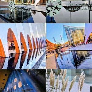 水辺に浮かぶカタール館が ステキです🤍 パンパスグラスが そっと揺れていた…🌾🌾 お隣りのアラブ首長国連邦のナツメヤシ柱も見えています