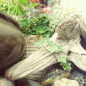 この横にメダカの睡蓮鉢3つ、下に繁殖用容器2つを並べています。リクガメくんは日々我が家のメダカを見守っています(^o^)v ミツガシワは株は立派になったけどなかなか花をつけてくれません(T^T)