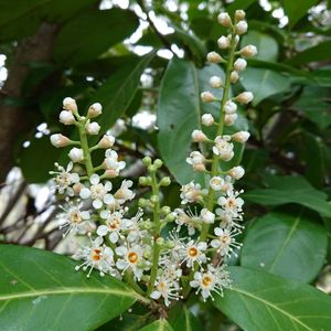 "セイヨウバクチノキ" (西洋博打木) 月桂樹のような葉をつける"桜の仲間"だそう。 確かに葉は似ていますが、桜の仲間とは、、不思議です。 別名:ビランジュ/チェリーローレル 学名:Prunus laurocerasus 英名Cherry-laurel ドイツ名Kirschlorbeer バラ科サクラ属