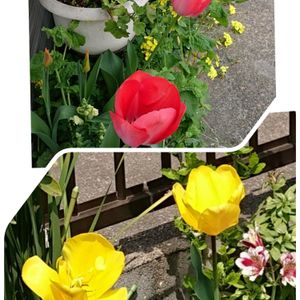 チューリップ、赤、黄 同時投稿します‼️。 堪能して、下さい。 🍀 🕊️ ⬆️ 🍀