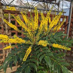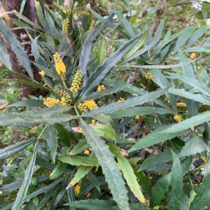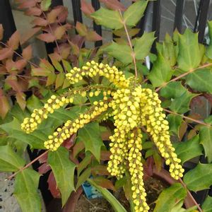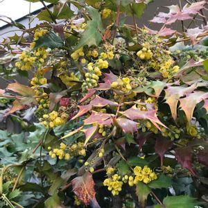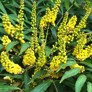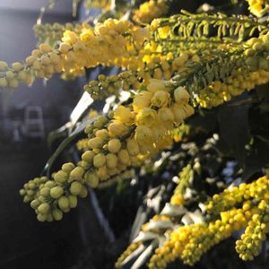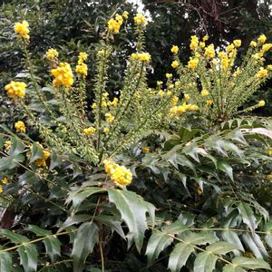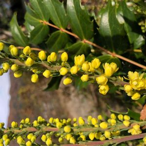 散歩の途中🚶♂️ 塀から見事に四方八方に上に向かって突き出した花穂🙄 元気出ます‼️ ☘️セイヨウヒイラギナンテン☘️ 我が家にある柊南天の花は春だったなと、花はこんなにゴージャスじゃなかったなと。 調べてみました。 中国・台湾原産のヒイラギナンテンと中国南部・ミャンマー原産のオイワケヒイラギナンテンを交配してできた園芸種でした。 メギ科 ヒイラギナンテン属 花期: 11ー1月 流通名: マホニア,ヒイラギナンテン どんどん新しい園芸品種が出てくるのについていけてないなぁ💦