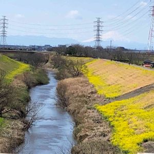 江戸川付近。 ドライブ中、菜の花がキレイだったので助手席の息子に撮ってもらいました。 カラシナ? わからないけど、春を感じます💛 たまたま向こうに富士山🗻 気がついていない息子👍