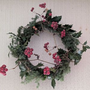 アオツヅラフジ と サルトリイバラ 今年はどちらも豊作♬ アオツヅラフジのツルを丸めて飾る💙葉も実も、水分が補給されないとすぐに萎れてしまうけれど、しばらくはフレッシュリースを楽しむことにする🔵 うちの外壁には欄間を嵌め込んである🟫欄間はこの家を手に入れた時に蔵に残っていたもので、住まっていたお爺さんが趣味で彫っておられたそうな🟤 その欄間にサルトリイバラを絡めて、さらに余った枝を、黒い板塀に飾ってみた🟥 厳しい寒さが続きます……ご自愛ください❄:( ´꒳`):❄