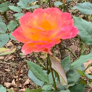 薔薇リオサンバ🌹 リオのカーニバルをイメージした鮮やかな花です。 今年の春に新苗でお迎えし、いよいよ枝も充実してきたのか、立派な花が咲きました🤗 ですが、2メートル超えの位置なので、来年、本気出したらどうなっちゃうの😱