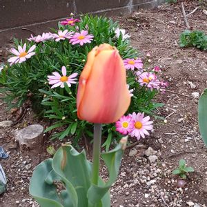 ♪咲いた~咲いた~チューリップの花が~ 昨年の球根なのでちょっと傷があるのですが、よくがんばりました💮 偶然うしろは今日のお花