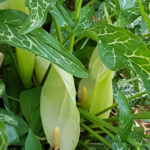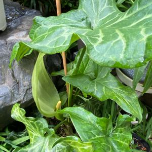 アラム イタリカム⁉️ 義母が10年ほど前植えて何かわからないと言っていた 綺麗な葉っぱがあったのですが昨日漸く咲きました 花芽が上がって来たって思っていたら紙風船が開いたみたいに中の白いお花が見られました(仏炎苞) 球根が大きくならないと咲かないものらしいですね 赤い有毒の実ができるようですが、一本しかないので見られませんよね⁉️😅