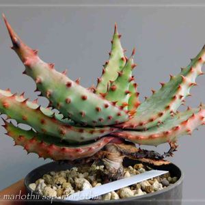 アロエマルロシー 先日の旅行帰りにふらっと寄った園芸店で後ろ髪を引かれて連れて帰って来ました。 バルタン星人みたい。