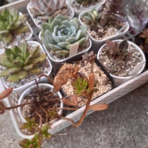 やっと外にいても暖かい日が きました☀️ ダメ元で植えた七福神は根付いて お子がいた 放置してた朧月とブロンズ姫も のびのび👍雹でズタボロになった時は凹んだな~💧 植え替えしたりお子を外してみたりしてたら宅配きた💨 久しぶりのポチッ多肉🌵名前にローズがついてたら指が📱
