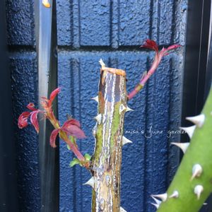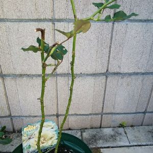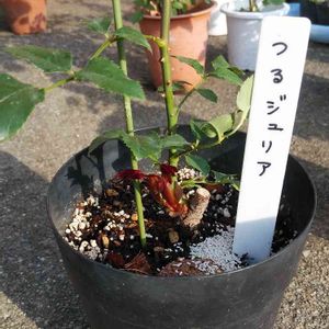 名前の記録兼ねて投稿 先月末にHCの見切り品コーナーから薔薇を二鉢連れ帰ってきました🙌🎵 多分春からの売れ残りで、秋の入れ替えで放出された感じかな? もう「状態の良いコ」ってのは皆無でしたが😅3000円超えの大苗も、全て300円👀❕かろうじてタグの名前が読めた(タグ落ちが半数以上、残ってても日焼けなどで読めない💦)コの中から、好みのコを💕 手厚い看護で二週間ちょい、新芽も見えてきてひと安心です😆✨
