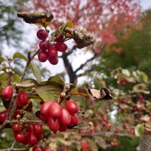 グミに似た実はサンシュユの実、美味しそうだけど調べてみると漢方に使われてる見たいです🦙…バックの木はハゼの木かな・・・🧐