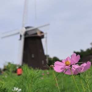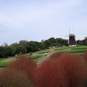 花博記念公園 鶴見緑地 残念ながら天気が悪くて曇り空でした(>_<) でも、風車を背景にコキアやコスモスが咲いていて、 のんぴりできました(^^)v