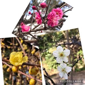 こんばんは😊 💠 紅梅 💠 梅 💠 蝋梅 💠 梅の花三種 ❤️✨️🤍✨️💛✨️ 花博記念公園鶴見緑地にて