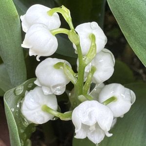 大きな葉の間でひっそりと咲く 今日のお花 スズラン 別名;君影草 我が家の庭より 30数年前の一株が増えながら現在も春の訪れを知らせてくれます。(ドイツスズラン) 庭はドクダミに占領されているので大きな鉢植えにして管理をしています 雨粒を一杯乗せた花姿がいじらしく 又清楚で可憐 💚🤍💚🤍💚🤍💚🤍💚 25/04/24 雨上がりの朝撮影