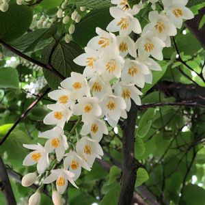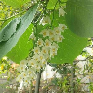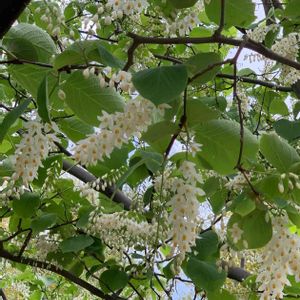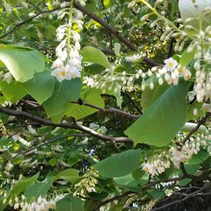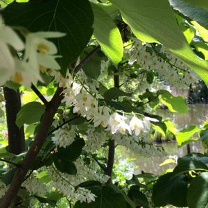 うちの裏手にある ハクウンボクの木🌿 今年も連なって白い可愛い花を 咲かせ始めました♡ 毎年 ゴールデンウィークの頃に 咲きます😊 来たばかりの頃は、大きな葉で空が見えない程に大きく しげっていましたが この所、少し弱って小さくなりました