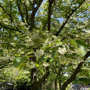 白雲木が満開です☺️ 木の下にいると、ほんのり甘い香りと 蜜を必死に集める蜂さん🐝たちの羽音と 風が吹くたびにぽとぽとと落ちるお花の音 なんか、しあわせ〜な気分です☺️