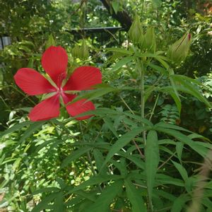 1️⃣花友さんから頂いた原種の ハイビスカス ロバツス🌺 這性の小さなお花ですが 以前育てていて又育てたいと 思っていたお花です💓 2️⃣これは去年からハンギングの中に育っていて最近お花をつけました 多分イグサのようです🌿 3️⃣これも鳥さんの落とし物 ソヨゴでしょうか? 4️⃣お散歩で毎年見上げて驚くうちわサボテン3m位あります🌵