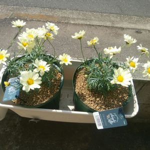 🌿 マーガレット アンジェリック ✼••┈┈┈┈┈┈••✼••┈┈┈┈┈┈┈••✼ 撮影前に花殻を摘んだら数が減ってしもうた(^^ゞ 商品タグより、四季咲きの「マーガレット アンジェリック」という名らしい。 ご近所は道路側にプランターを出っ張らせない慣習がある??? ようなのでアパート寄りにプランターを配置しています。(^^ゞ 表土を硬質赤玉土で被っています。