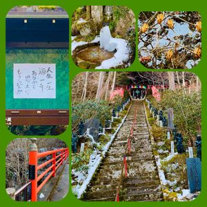 こんばんは🌠 年が明けて、やっと御不動尊に お札を納めに参りました😊 右下•階段130段何のこれ式💪🦶 右上•ヤマユリの種が行灯のよう✨ 右上中•山水の滴る池、ツララ寒っ❄️ 左上•掲示板仰る通り🍶✌️ 左下•開運橋〜ご利益が有れば🙋♀️ 因みにおみくじは、末吉💮 甘酒を頂き、癒しの一日 お疲れさまでした🍀 見にくい画像で申し訳無いです🙇♀️