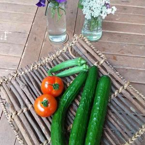 今日の収穫です🎵 オクラ2本、中玉トマト2個、キュウリ3本✨😊💞