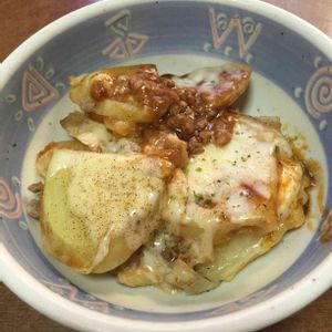 本日収穫したジャガイモをチーズ焼きにしてくれました🎉😙 見た目はともかく美味し‼️