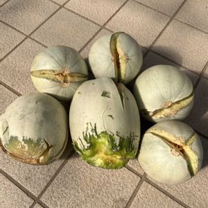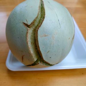 プリンスメロン🍈 3個目 強制収穫。亀裂が入ってしまたっからです💦 1個目2個目、小さいながらも、凄く美味しかったので、期待が高まっていたので 残念です。高温と水が関係あるのかな〜? あと 7個くらいは、無事育つかしら?