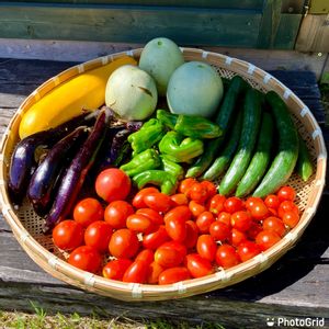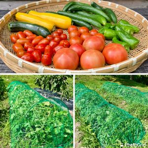 残りの🍉🍈を死守するために、防鳥獣ネットを設置〜💦。 🦝🐦⬛達との知恵比べには、時々虚しさを感じるねー😮💨。 野菜畑の恵みは、🍅🫑🥒など😊。 それにしても暑い🥵、野良仕事は早めに切り上げよう💨。