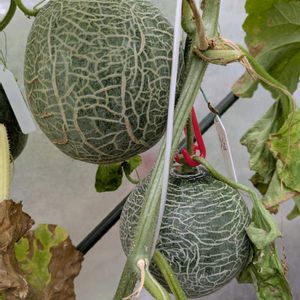 ①ムーンライトメロン これ以上大きくはならないので1個収穫しました。 追熟してからカットしたいと思います。 ②プリンスメロン 自然落下しました、 こちらも追熟してから食べようと思います。