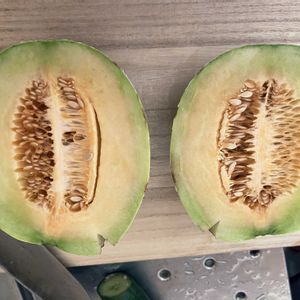 畑から香る甘い香り〜👃、昨晩、プリンスメロン6個🍈🍈🍈🍈🍈🍈を収穫😊。 獣🦝にやられちゃう前に採らないとね💪。 そして、いつもの「パカっ!」とな🔪、かなりいい感じ💮🤤。