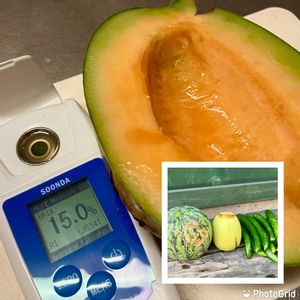 夕方の野菜畑の恵みは🍉🍈🥒✨。 プリンスメロン🍈も、毎度懲りずに「パカっ!」とな🔪、いい色だねー😍。 気になる糖度はBrix値15、我が家にしては上出来でしょ🤤。