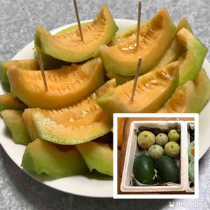 スイカ3個離脱😢、カラスがやらかしおった💢。とりあえず危なさそうな5個🍉🍉🍉🍉🍉(第20〜24号)を収穫💪。 次いでにメロン6個🍈🍈🍈🍈🍈🍈(第33〜38号)も収穫💪。 そして、上の子行きの仕送り箱📦完成✌️。