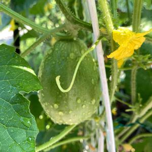 今週、初めて収穫しました。4個のうちの2つが落ちました。クッションのネットを被せていたので無事でした。 食べごろがいつなのか?😅