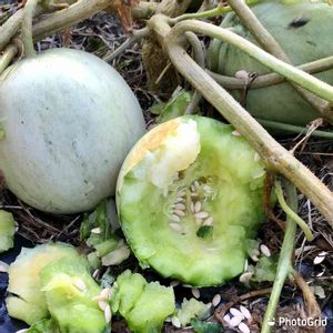 畑のメロン🍈、上から見たヘタの変色やひび割れを収穫目安にと待っていたが、お尻がひび割れた5個を発見。これも採り頃合図なのか?、それとも雨の影響か?🤔。慌てて第2〜6号を収穫した😊。「パカっ!」とな、うーんいい香り^_^、悪くなさそう👍。