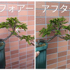 見る度に気になり、我慢できず 針金をかけました💦 でも最小限に留めています。 気になる点は、2つ。 頭が二つあり、どちらも真っすぐな 枝であること。 下枝が少なく、幹筋と枝の空間が 空きすぎていること。 針金をかけて修正をしたのが アフターの写真です。 向かって左側の頭を下げて 幹に寄せて枝としました。 右側を芯として流れをつけました。 荒いですが、樹形は出たかな。 半懸崖までイジらないで、 斜幹でまとまりそうです。 後は枝を枯らさないことですね。 管理に気をつけて参ります💦