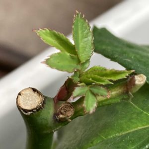新郎母としてもらった花束のバラ、アブニールを挿し木しています。 芽かきがされていましたが脇から芽が出てきました。