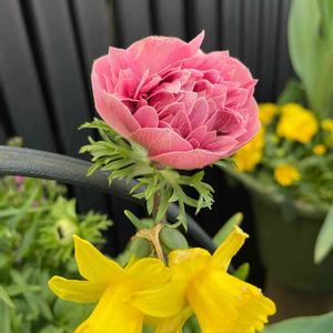 寄せ植えに入っている八重咲きのアネモネが、夜になって🌖閉じてステキな色だったのでパチリ🤳 偶然、ミニ水仙が一緒に写り込んで面白い写真になりました😃 私にはマイクに結んだ🎤リボン🎀みたいに見えます😁
