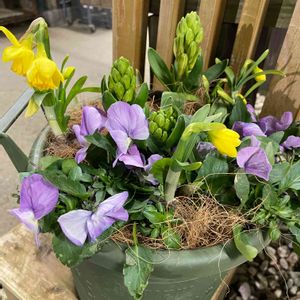 少し前2022.2.1の写真ですが、秋植え球根2022に🌼 ヒヤシンスはピンク、白、ブルー🫐の3色植えの芽出し球根🌱 水仙テータテート 反対色の優しい薄紫のビオラを合わせれば簡単でステキな寄せ植えになります😃