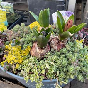 秋植え球根2022コンテスト用に写真🤳見つけたけど、肝心のヒヤシンスまだ色づいてませんでした😅 3色のヒヤシンスの芽出し苗🌱 のまわりをセダムでかためました😁
