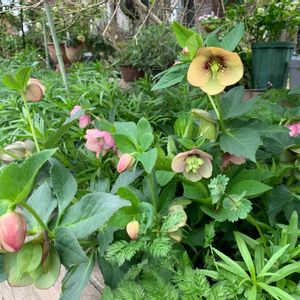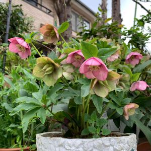 4月1日のボーダー花壇のクリスマスローズです☺️ 花柄取りに行ったけど、まだまだつぼみがたくさんあって切れません😅 アプリコットとピンクのクリスマスローズ2株が植えてあって、混じりあって綺麗✨