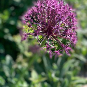直径10センチほどのアリウムです😀 朝日☀️浴びてキレイ💕 2年前に、直径15センチになるというのを3個植えましたが、最初の年は3個で去年は咲かず💧こちらも冬の馬糞堆肥が効いたのかひとつ立派なのが咲きました✨
