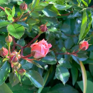 朝日にキラキラ✨輝いているドリフトローズ アプリコットのつぼみです☺️