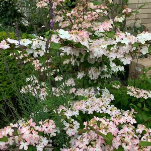 ヤブデマリ ピーチファッション🍑です☺️ 10年くらい前かなぁ、鉢植え🪴で置いたら、下から根を張り、すっかりそこに定着してしまいました😅 鉢植えだから、あまり大きくならないでいたけど、ここ2年ほど一気に大きくなり、剪定も自己流😅でもキレイに咲いてくれました💕
