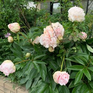 ボーダー花壇、バラ🌹の足元の八重のシャクヤクです☺️ここ数年、すごいボリュームで咲くので、咲きはじめのバラより目立っています😅 つぼみの大きさ、花びらの多さが半端なく、頭が重すぎるのが悩みです。 これでも、ガーデンフェンスを入れて支えているのですが💦